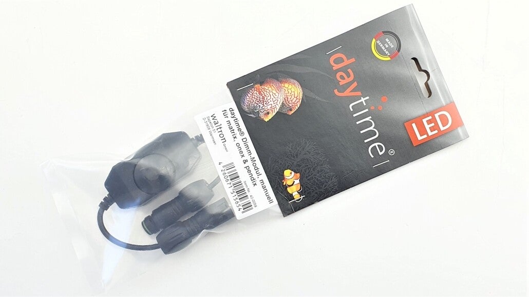 Mit dem manuellen Dimm-Modul kann die Helligkeit optimal zu den Lichtverhältnissen der Umgebung angepasst werden. Es wird einfach zwischen Anschlußleitung und Netzteil gesteckt – Plug & Play. Empfehlenswert ist der Betrieb in Verbindung mit einer handelsüblichen Zeitschaltuhr, die das LED-System komfortabel automatisch ein- und ausschaltet.